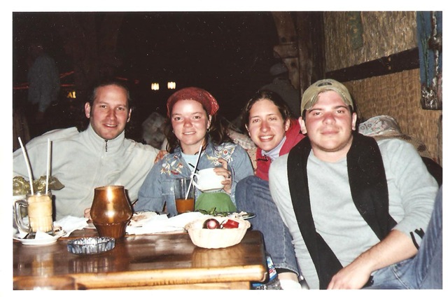 The other artist whose cafe scenes I wouldn’t mind hanging in my living room (hint, hint generous reader-turned-artwork-donor) are the watercolors by Azriel Cohen. Raised in Toronto, Canada, Azriel now tours the world and paints cafes and city life wherever he goes. Actually, I met him on one of his adventures to Sinai in Egypt in January or February 2005, I can’t remember (oy!). He heard me and my friends speaking English and we started talking. Here are some words of wisdom about going to Sinai in the winter months: Don’t be fooled thinking “Egypt, that is south of Israel, and probably warm”. Don’t do it unless you enjoy being very, very cold! I rummaged around and actually found the picture of us with Azriel(far left):