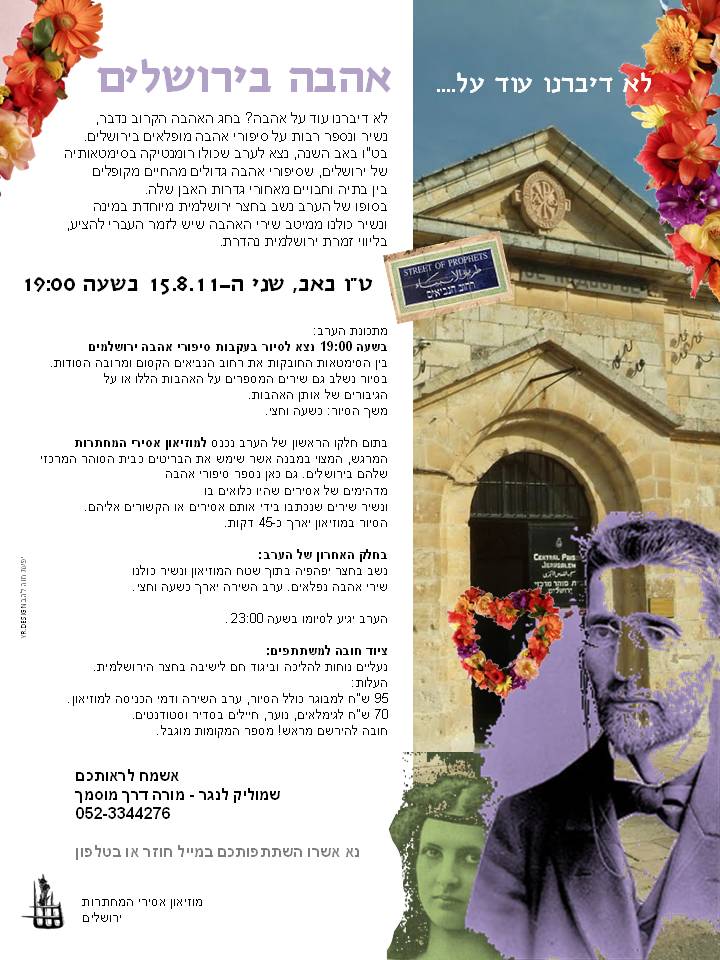 An evening about love including short films from Ma’aleh Film School, stand up with Daniel Kishenovsky, Hakovah Hahafuch- songs to make you dance, lectures about love and so much more. More info